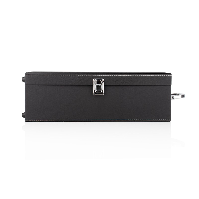 Contiene: Sacacorchos descapsulador de 1 tiempo, cortagotas, tapón metálico, termómetro y aro antigoteo, con apliques en madera. NO INCLUYE LA BOTELLA DE VINO.