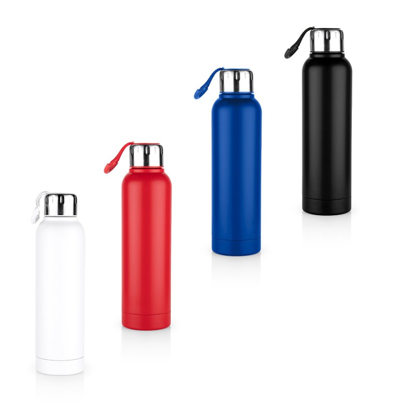 Botella fabricada en acero inoxidable, equipada con tapa de cierre giratorio y cordón integrado que facilita su transporte. Su diseño resistente y funcional la hace adecuada para uso diari