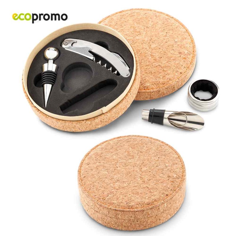 Estuche rígido en corcho con argolla antigoteo, corcho, boquilla y descorchador con navaja de sierra y destapador. Empaque Caja Individual. Medidas Estuche: 4 cm x 14.7 cm diámetro Marca: 5 cm / Láser Ficha Técnica