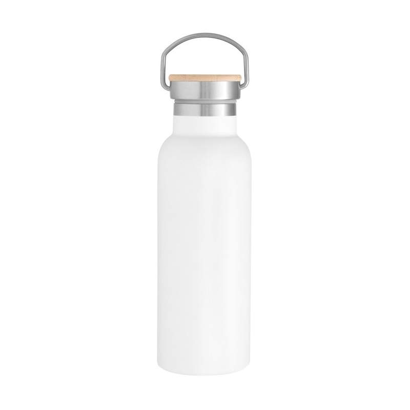 Ø 7,2 x 22,3 cm. Capacidad 550 ml. Acero inoxidable. Botella con aislamiento térmico vacuum. Interior en acero 304 y exterior en acero 201. Tapa de acero inoxidable con manija metálica rebatible y detalles en bambú. Anillo de silicona antiderrame. Mantiene hasta 6 hs la temperatura de las bebidas calientes y hasta 10 hs la de las bebidas frías. Presentación en caja de regalo Kraft.