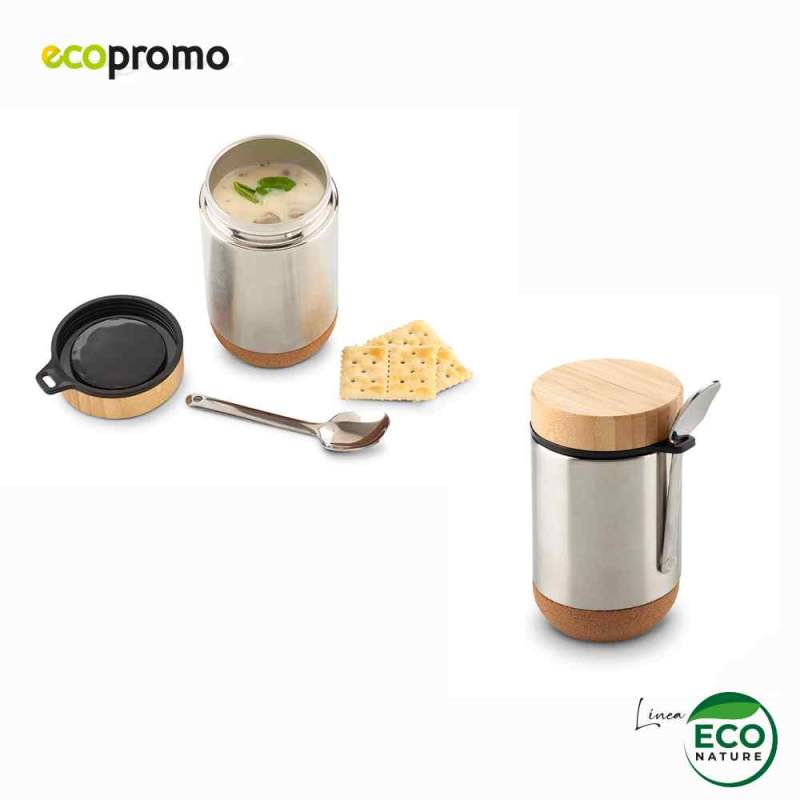 Portalíquido metálico en acero inoxidable doble pared, tapa rosca plástica y en bambú, y base en corcho. Incluye cuchara metálica. Empaque caja individual.