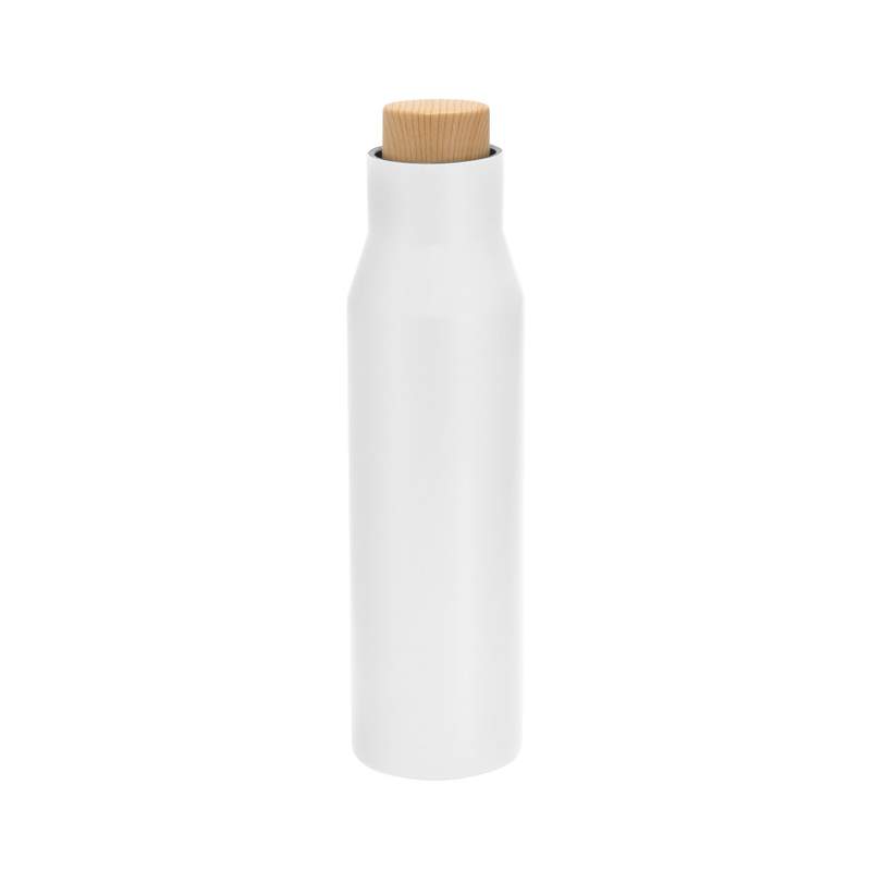 Ideal para llevar a tus actividades diarias.Botella doble pared, sellada al vacío, con aislamiento térmico vacuum. Interior de acero 304 y exterior de acero 201. Pintura acabado mate. Tapa a rosca con anillo de silicona, interior de acero 201 y exterior en polipropileno imitación bambú. Mantiene hasta 6 hs la temperatura de las bebidas calientes y hasta 10 hs la de las bebidas frías.Medidas: Ø 6,8 cm x 26 cm.  Capacidad: 500 ml. Materiales: Acero inoxidable.   Presentación: en caja de regalo kraft.