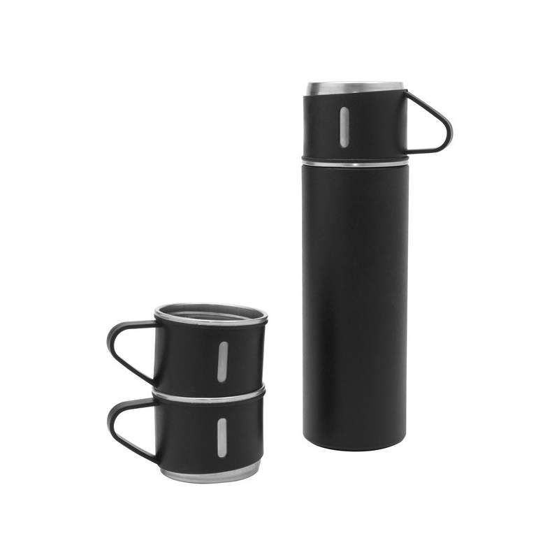 Ø 6,5 cm x 23,5 cm. Acero inoxidable y Polipropileno. Capacidad 500 ml. Set de termo y tres tazas. Termo con doble pared sellado al vacío. Tecnología Vacuum. Acero inoxidable 304 interior / 201 exterior. Tapa y tazas Ø 6,5 cm x 5 cm. Capacidad 120 ml. Acero inoxidable 304 interior / Polipropileno exterior. Pintura acabado mate. Mantiene por más de 12 hs la temperatura de las bebidas calientes y 24 hs de las bebidas frías. Presentación en caja de regalo Kraft.