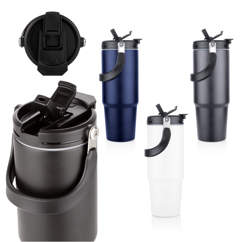 Esta botella metálica es ideal para todo tipo de bebidas. Cuenta con una manija resistente, integrada en la tapa mediante una sólida pieza de metal, que facilita su transporte y almacenamiento. Dispone de dos boquillas para el consumo de líquidos: una tipo boquilla y otra tipo pitillo, ambas con tapas de seguridad. Además, posee un borde de caucho que previene derrames. Mantiene las bebidas frías por 8 horas y las bebidas calientes por 4 horas. Capacidad 1000 ml / 34 Oz.