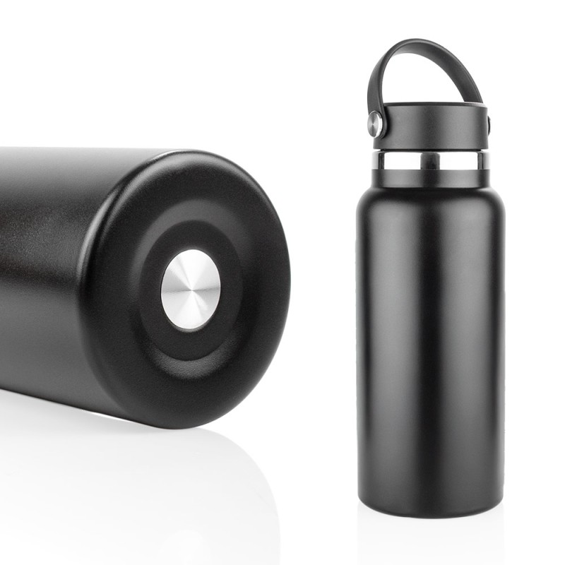 Botella elaborada en acero inoxidable con tapa rosca y asa plástica para facilitar su transporte. Capacidad: 1000 ml / 34 Oz.