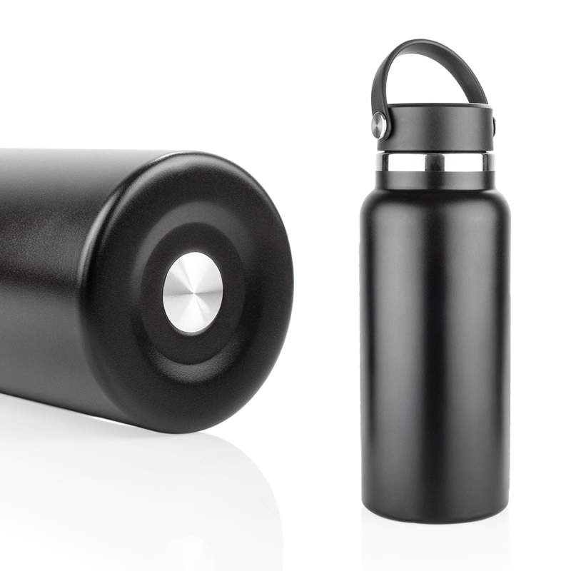 Botella elaborada en acero inoxidable con tapa rosca y asa plástica para facilitar su transporte. Mantiene las bebidas frías por 24 horas y las bebidas calientes por 12 horas. Capacidad: 1000 ml / 34 Oz.