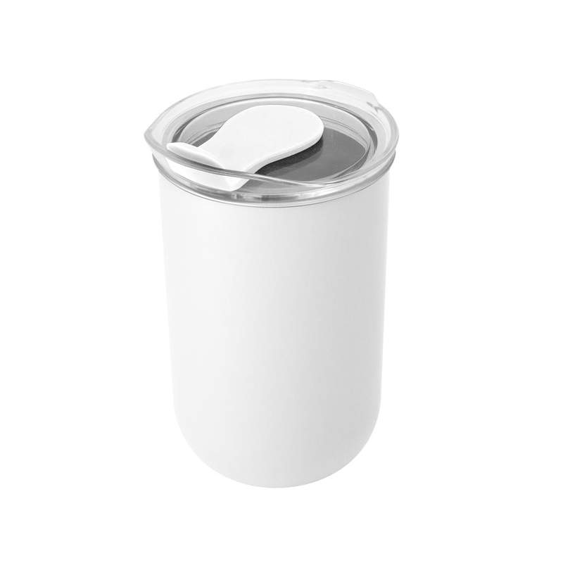 Elegancia en MovimientoMug doble Pared. Interior de acero inoxidable 304 y exterior de polipropileno. Pintura acabado mate. Tapa plástica transparente a presión con anillo de silicona y ci