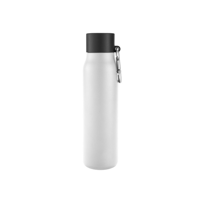 Acero reciclado, resistencia aseguradaBotella doble pared, sellada al vacío. Interior en acero 304 reciclado y exterior en acero 201. Pintura powder coat (pintura más duradera y resistente a la corrosión y el paso del tiempo). Tapa plástica de polipropileno y anillo de silicona con mosquetón de aluminio. Mantiene hasta 12 hs la temperatura de las bebidas calientes y 24 hs de las bebidas frías. Medidas: Ø 6,5cm x 25 cm.  Capacidad: 550 ml.  Materiales: Acero inoxidable reciclado, polipropileno y aluminio.  Presentación: en caja de regalo Kraft.