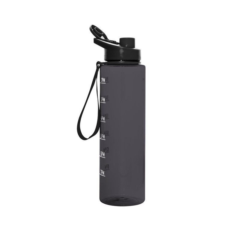 Tu meta en cada sorbo.Botella con marcador de tiempo y medida. Color translúcido con tapa plástica flip top con asa, boquilla y correa del mismo color de la botella.Medidas: Ø 7,5 x 27,5 cm. (con tapa)  Capacidad: 1000 ml. Material: Plástico PETG, polipropileno y silicona.