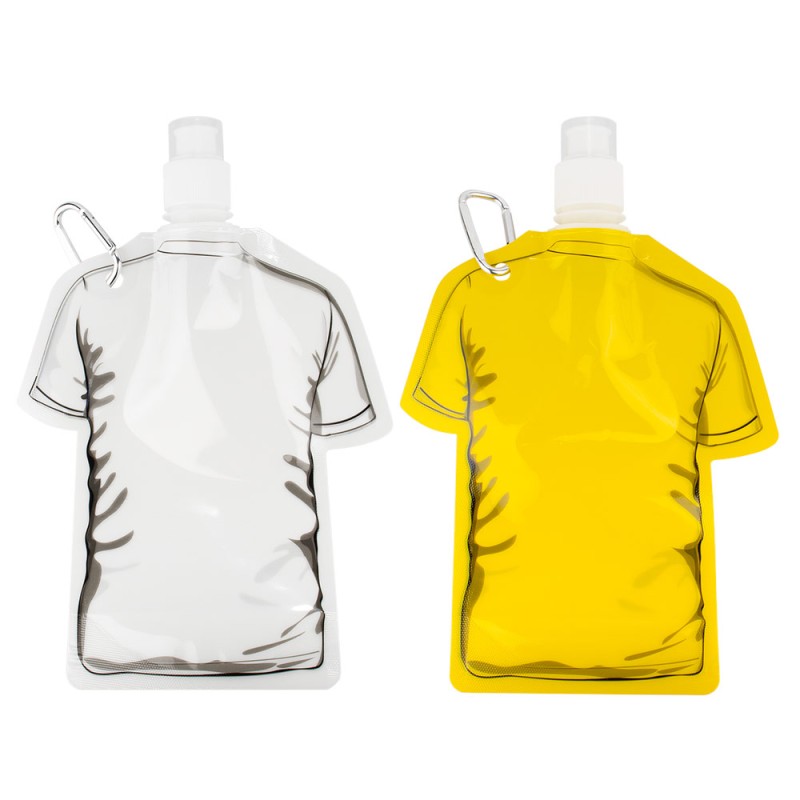 Botella plegable con forma de camiseta, fabricada en PET, ideal para actividades al aire libre o eventos. Su diseño compacto permite doblarla cuando está vacía, ahorrando espacio en mochilas o bolsos. Cuenta con tapa de cierre giratorio y boquilla con tapa adicional, que garantiza un consumo higiénico y seguro. Incluye gancho carabinero para sujetarla fácilmente a mochilas, cinturones o llaveros. Capacidad: 480 ml / 16 Oz.