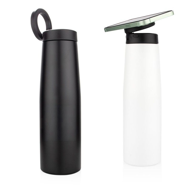 Termo con tapa de cierre giratorio, tecnología MagSafe (Ø 5,6) y doble pared de acero inoxidable. Su tapa permite colocar el celular en posición horizontal o vertical gracias al soporte magnético integrado. Capacidad: 540 ml / 18 Oz.