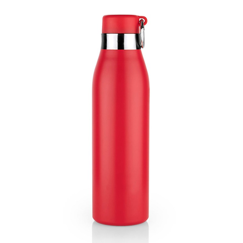 Botella fabricada en acero inoxidable, equipada con tapa de cierre giratorio y gancho carabinero que facilita su transporte. Cuenta con base antideslizante que proporciona mayor estabilidad en superficies lisas. Su diseño resistente y funcional la hace ideal para uso diario en movimiento. Gracias a su tecnología de aislamiento, puede mantener bebidas frías o calientes por aproximadamente 8 horas. Capacidad: 500 ml / 17 Oz