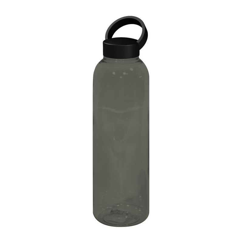 Botella de plástico color negro con tapa a rosca plástica. Medidas: Ø 6,5 x 21,5 cm. (sin tapa) y  Ø 6,5 x 25 cm. (con tapa) Capacidad: 600 ml. Peso: 61 g. (botella) y 12 g. (tapa) Materiales: Plastico PET y polipropileno. ATENCIÓN  Botella y tapa se entregan por separado. / No utilizar con bebidas gaseosas ni líquidos calientes. / El manejo de este producto es delicado. / No exponer al sol y temperaturas altas por tiempo prolongado.