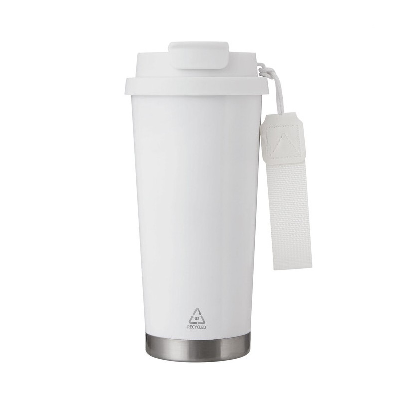 Ideal para jornadas largasMug doble pared, sellado al vacío. Mug con aislamiento térmico. Tecnología vacuum. Interior en acero 304 y exterior en acero 201. Tapa de polipropileno a rosca y anillo de silicona, 2 en 1, con pitillo de polietileno incorporado, seguro antiderrame a presión y correa de poliéster. Tapa y correa del mismo color que el vaso. Pintura con acabado mate, textura suave al tacto. Base en acero 201. Mantiene hasta 12 hs la temperatura de las bebidas calientes y 24 hs de las bebidas frías.Medidas: Ø 9 x 19 cm. Capacidad: 500 ml. Materiales: Acero reciclado, polipropileno, poliéster, polietileno y silicona. Presentación: en caja de regalo kraft