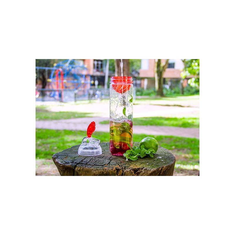 Botella deportiva con tapa rosca, agarradera y colador ideal para hacer infusiones. Libre de BPA, ftalatos u otras sustancias nocivas. No retiene ni transmite sabores u olores. No es para líquidos calientes. Capacidad 850 ml. 29 Oz.