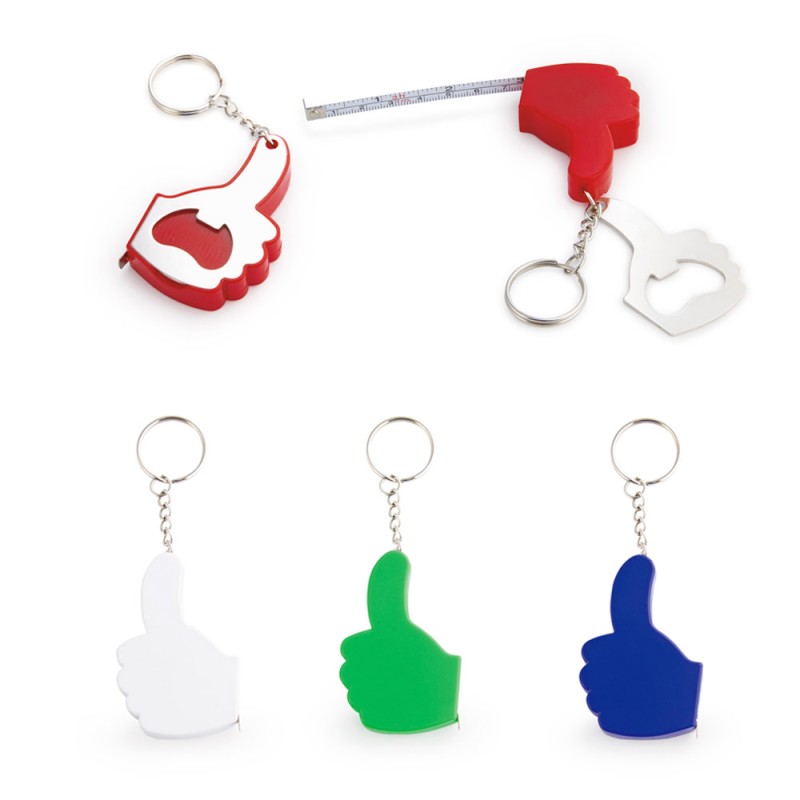 Llavero con destapador con forma de mano. Cinta métrica metálica de 1 metro/39 pulgadas.