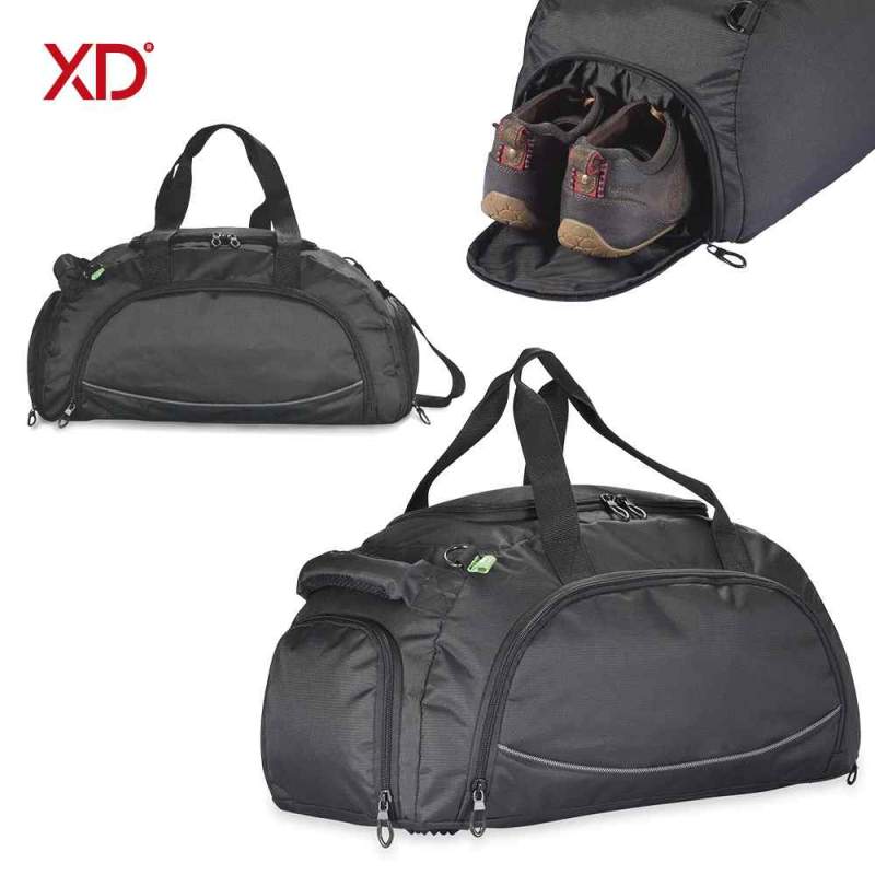 En poliéster 600D Ribstop. Bolsillo frontal con cremallera. Con organizadores interiores, bolsillo lateral, bolsillo portazapatos, asas acolchadas y manija para colgar. 4 soportes en