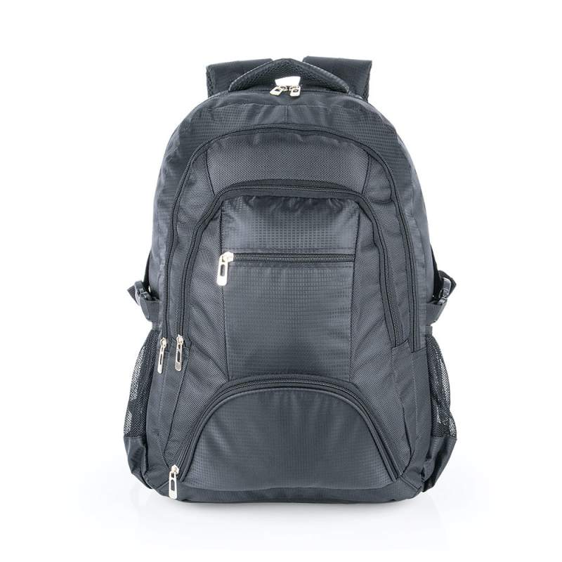 Morral con bolsillo principal cierre doble cremallera con compartimiento interior apto para portátil de hasta 19”, bolsillos laterales en malla optimos para cables, audífonos o bebidas; cargaderas ajustables y acolchadas, 4 bolsillos frontales con cierre de cremallera. Morral con refuerzo clip tipo cinturón. Volumen aproximado: 18 litros.