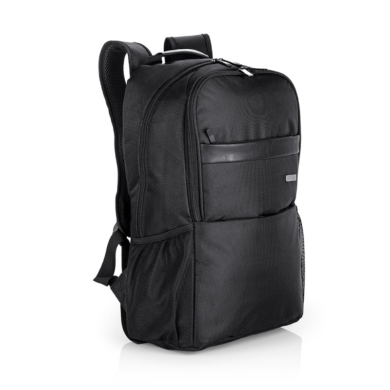 Morral Portalaptop con espaldar ergonomico, con cargaderas ajustables y acolchadas, 2 bolsillos exteriores, 1 bolsillo medio con compartimentos especiales en el interior, el bolsillo principal tiene un compartimiento para dispositivos portatiles de 15", 2 bolsillos laterales en malla ideales para botellas y cables . correa en la parte trasera para ajustar el morral a un trolley, Incluye placa metálica para marca láser. Volumen aproximado: 17 litros.