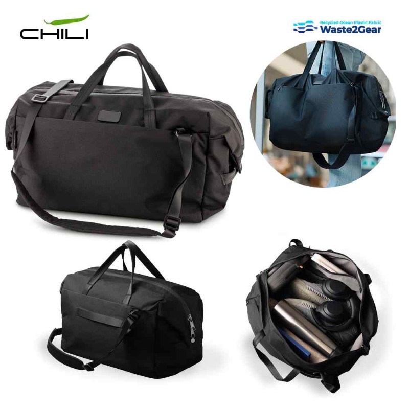 Maletín en poliéster reciclado de residuos plásticos recuperados del océano. Dos compartimentos con cierre de cremallera. Incluye placa metálica para marcar. Medidas: 52 cm x 32 cm x 22 cm . Marca: 3 cm Láser / 10 cm Screen Más información acerca de Waste2Gear en https://www.waste2gear.org/ VIDEO