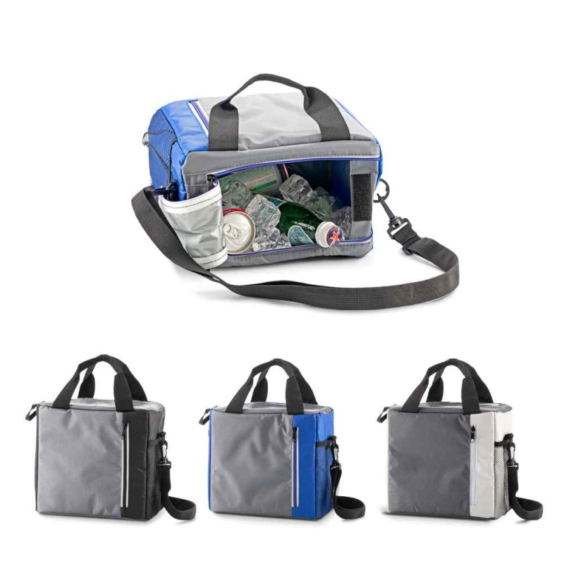 Nevera en poliéster con interior en PVC y cierre en cremallera. Un bolsillo externo con cremallera. Un bolsillo lateral en malla. Medidas: 22 cm x 25 cm x 16cm. Marca: 10 cm / Screen.