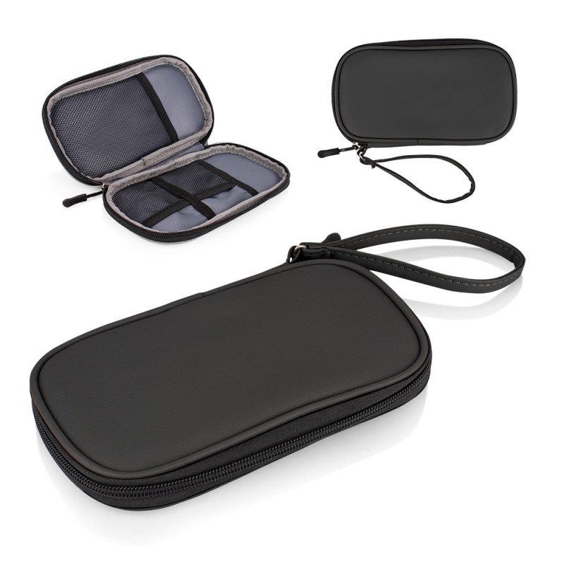 Útil y elegante organizador en material sintético con cremallera. Cuenta con divisiones internas en malla y correa externa.