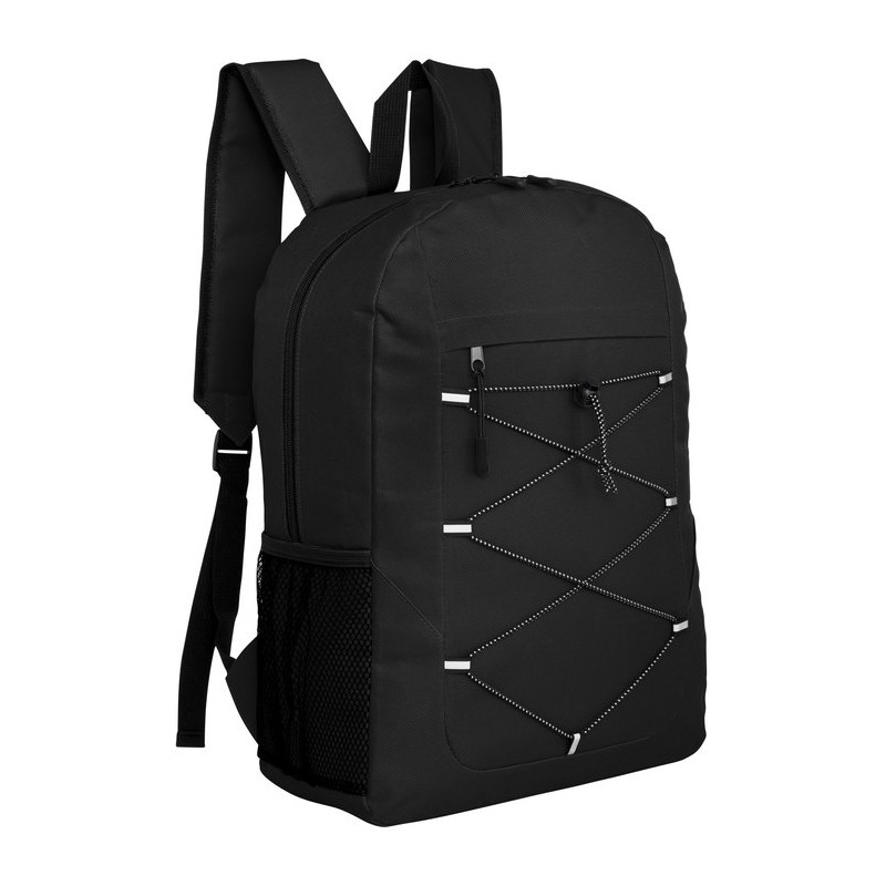 Diseñada para moverse, preparada para todoMorral outdoor. Compartimento principal con doble cierre. Bolsillo frontal con cierre, cordón elástico cruzado ajustable y un bolsillo de red lateral para transportar botellas. Detalles reflectivos. Cierres metálicos con deslizadores de goma. Correas regulables y espalda acolchadas.Medidas: 43,5 x 30 x 14.5 cm. Capacidad: 18 litros  Materiales: Poliéster 600D. Interior forrado en 210D. Espuma de polietileno.