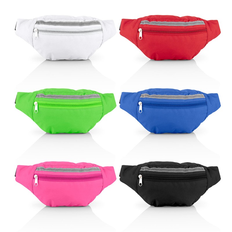 Canguro con bolsillo frontal y trasero con cremallera y correa a la cintura ajustable con broche de hebilla, linea antireflectiva en color gris.