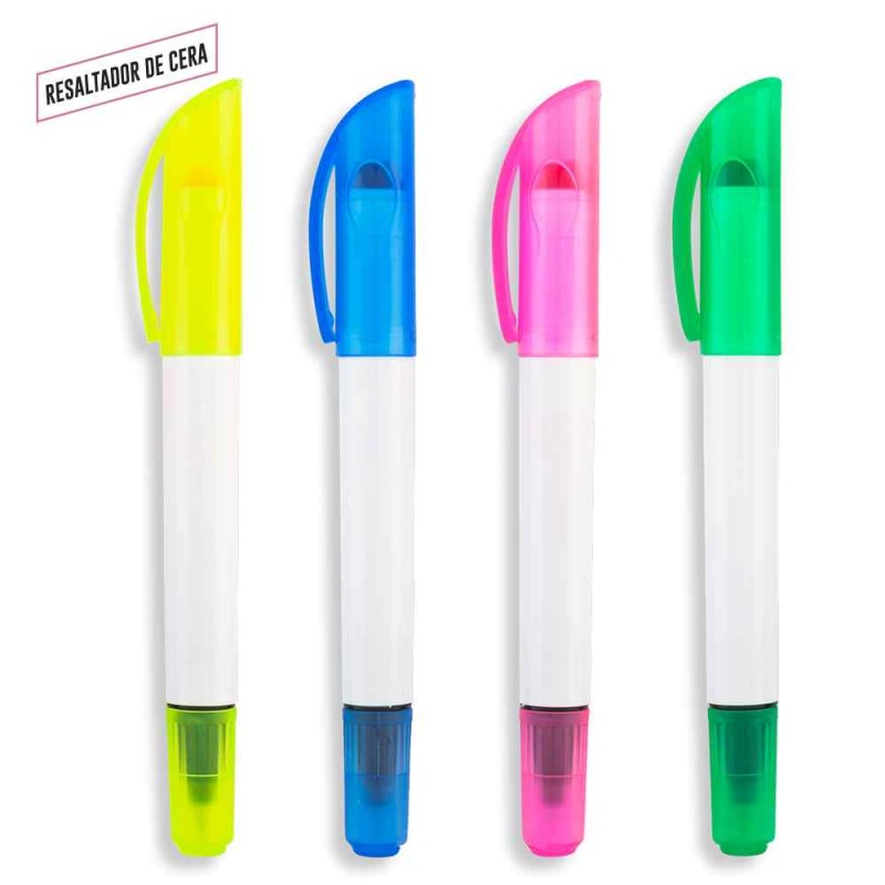 Bolígrafo plástico con resaltador de cera. No se seca. Medidas: 14.5 cm Marca: 3.5 cm / Tampografía Venta mínima y en múltiplos de caja de 50 unidades por color.
