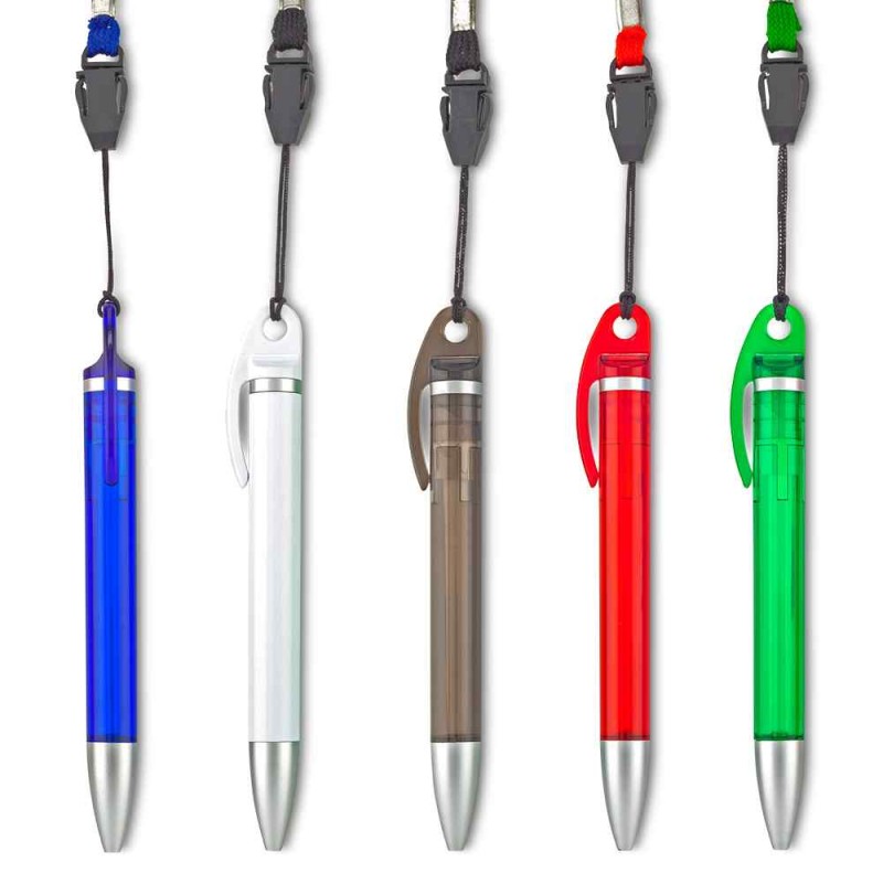 Bolígrafo plástico con cordón para cargar. Mecanismo twist. Medidas: 13 cm. Marca: 3 cm / Tampografía Venta mínima y en múltiplos de caja de 50