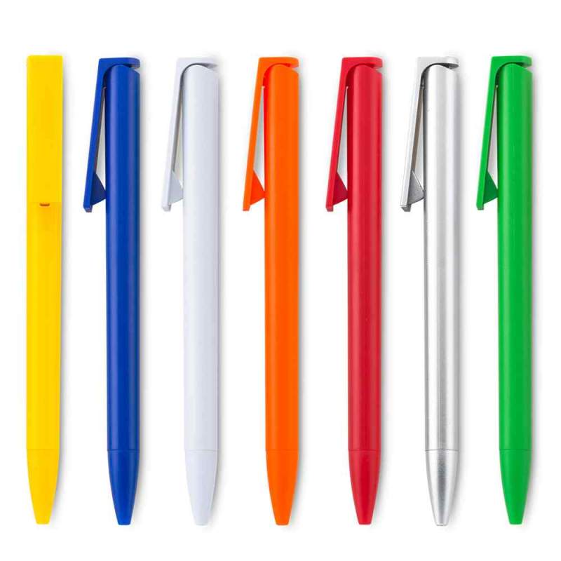 Bolígrafo plástico. Con obturador en el clip. Medidas: 14 cm Marca: 5 cm / Tampografía Venta mínima y en múltiplos de caja de 50 unidades por color.