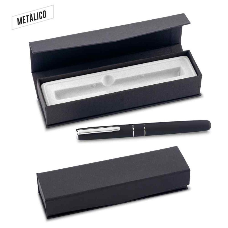 Metálico con acabado caucho, clip metálico. Empaque caja individual. Medidas:Estuche: 17.5 cm x 4.7 x 3 cm. Bolígrafo: 14 cm Marca: Estuche: 4.5 cm / Tampograf&ia