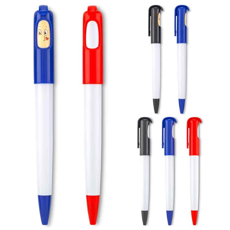 Bolígrafo plástico con barril interno giratorio. Barril interno opcional con tres caras o sin impresión para hacer tres logos. Mecanismo push. Medidas:14.7 cm Marca: 4