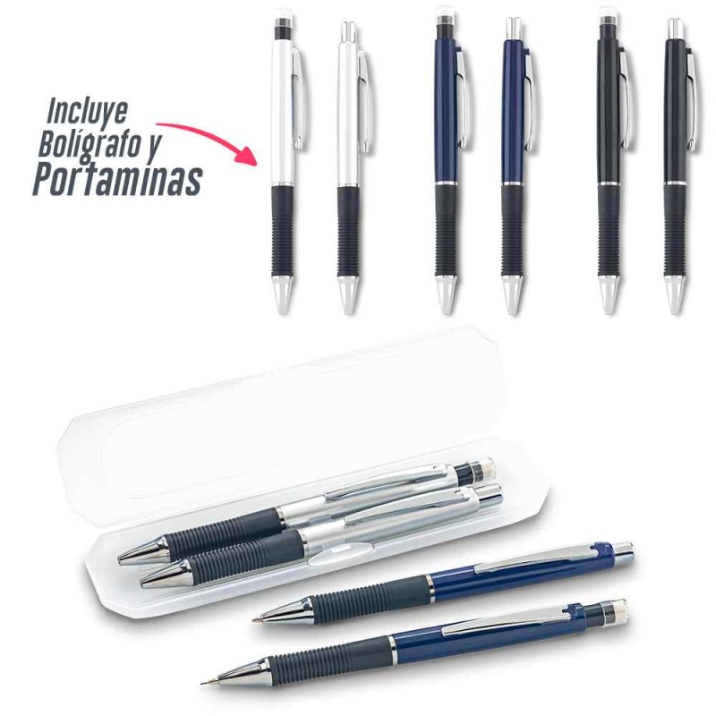 Set de bolígrafo y portaminas plásticos en estuche plástico. Mina portaminas 0.5 mm. Medidas: Bolígrafo: 13.5 cm Caja: 17 cm x 4.2 cm x 1.8 cm. Marca: 5 cm en el estuche / Tampografía con Empaque y desempaque Venta mínima y en múltiplos de caja de 50 unidades por color.  Ficha Técnica
