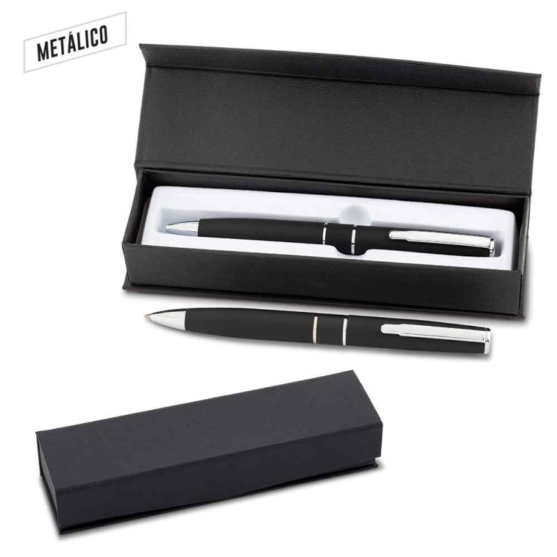 Metálico con acabado caucho, clip metálico. Empaque caja individual. Medidas: Estuche: 17.5 cm x 4.7 x 3 cm. Bolígrafo: 14 cm Marca: Estuche: 4.5 cm / Tampograf&iac