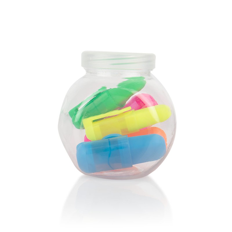 Juego de 5 resaltadores en estuche traslucido plástico. Colores rosado, naranja, azul, verde y amarillo.