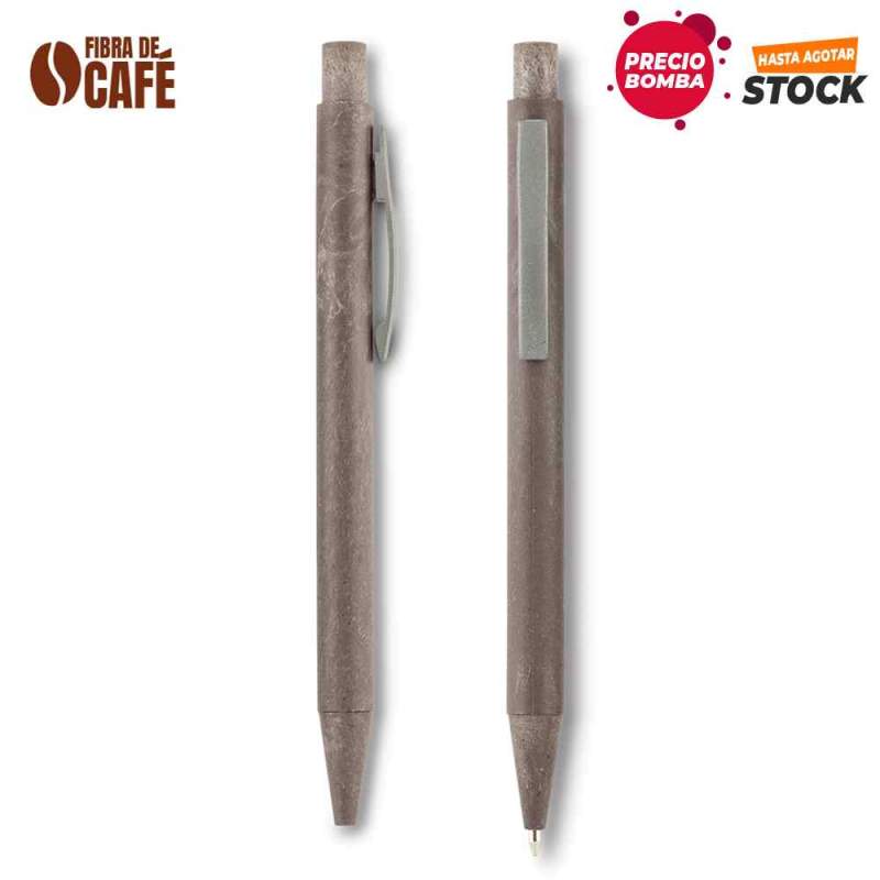 Bolígrafo elaborado en plástico ABS con fibra de Café. Mecanismo Push. El porcentaje de material ecológico tiene un promedio de biodegradabilidad de 2-3 añ