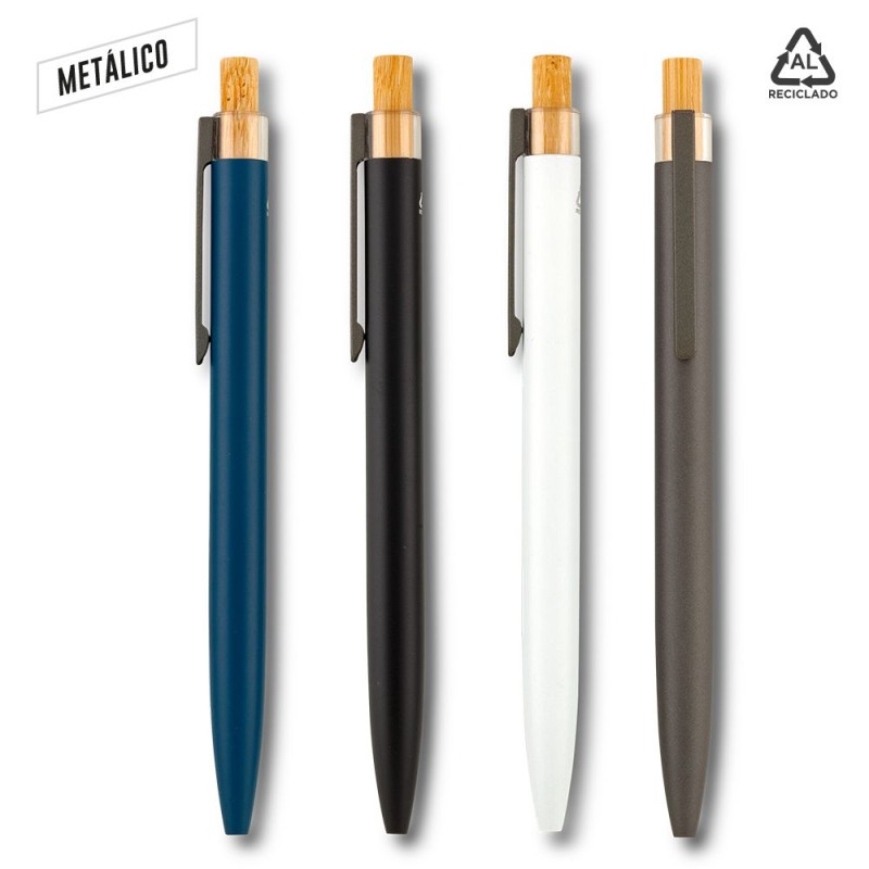 Bolígrafo en aluminio reciclado. Con partes en plástico y bambú. Mecanismo push. Medidas: 14 cm Marca: 4 cm / Tampografía Venta mínima y en múltiplos de caja de 50 unidades por color.   Ficha Técnica
