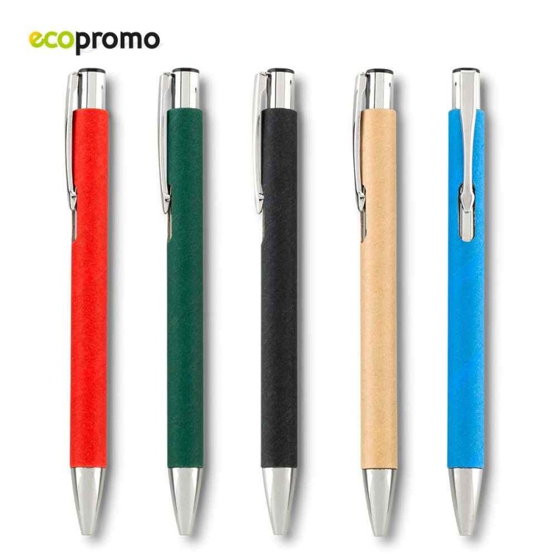 Bolígrafo con partes plásticas y cuerpo de cartón. Clip metálico. Mecanismo push. Medidas: 14 cm Marca: 4 cm / Tampografía Venta mínima y en m