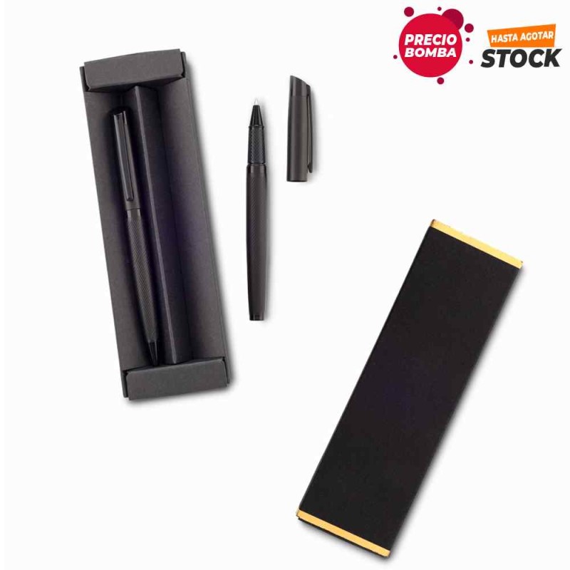 Set de bolígrafo con mecanismo twist y roller. Estuche individual en cartón. Medidas: Estuche: 17.3 cm x 5.3 cm x 2.1 cm Bolígrafos: 13.5 cm. Marca: Estuche: 4.5 cm / Tampografía. Bolígrafos: 3 cm / Láser en el barril. Bolígrafos: 3 cm / Láser barril superior. Ficha Técnica