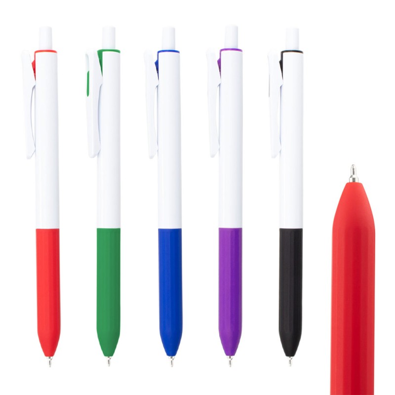 Bolígrafo cuerpo blanco sólido, clip desestresante, empuñadura y adornos de color. Sistema de apertura retráctil. (Bolígrafo/Esfero)