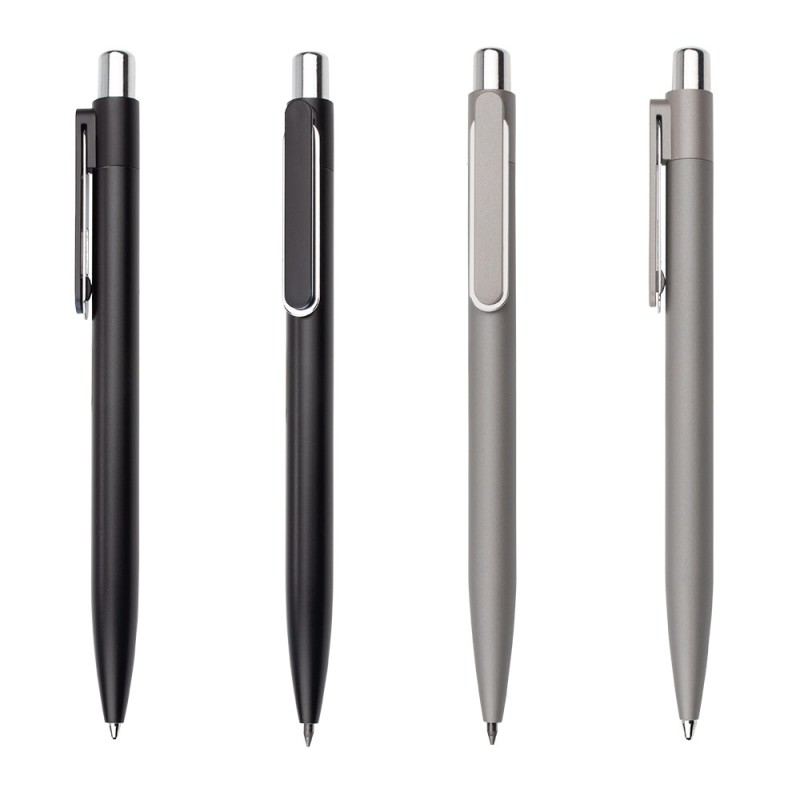 Bolígrafo retráctil de aluminio reciclado, más un lápiz externo de aluminio reciclado empaquetados en caja de cartón negra que se desliza para abrir. (Bolígrafo/Esfero)