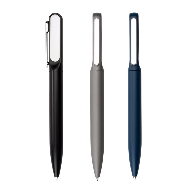 Bolígrafo de aluminio con diseño elegante y mecanismo giratorio. Acabado mate lacado, clip metálico cromado y detalle metálico superior. Incluye recambio tipo Metal Cross para una escrit