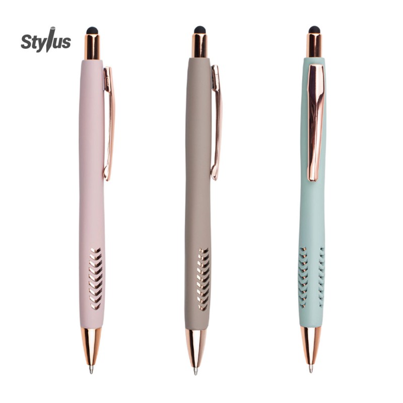 Bolígrafo con cuerpo de color sólido mate, suave al tacto, diseño sofisticado. Detalles metalizados rosa. Sistema de apertura retráctil con stylus para pantallas táctiles. En la parte i