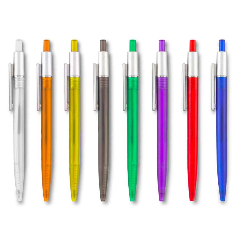 Bolígrafo plástico con mecanismo push. Medidas: 14.5 cm. Marca: 3.5 cm / Tampografía. Venta mínima y en múltiplos de caja de 50 unidades por color.