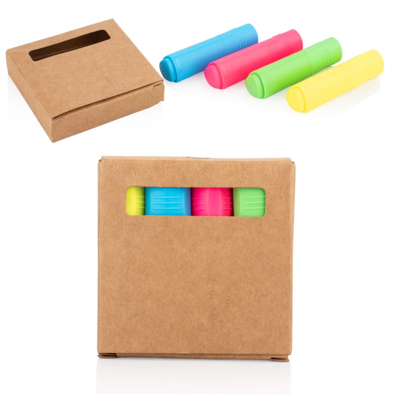 Este mini juego incluye cuatro resaltadores (7 X 1,7) en colores surtidos, presentados en una caja de cartón con ventana que permite visualizar su contenido. S