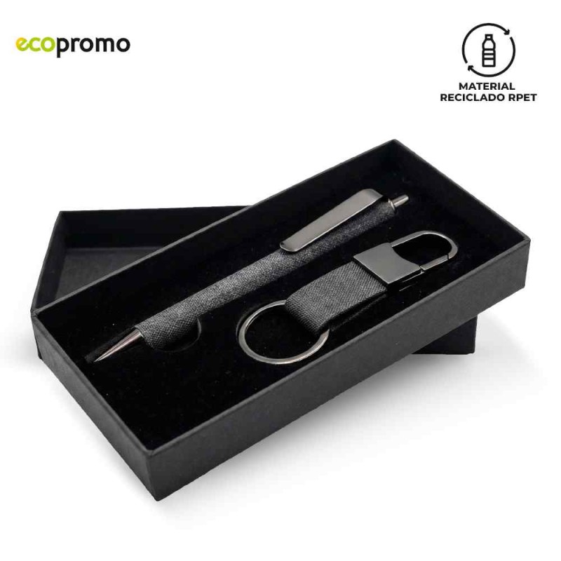 Set de bolígrafo metálico recubierto en tela reciclada RPET y llavero reciclado RPET. Empaque caja individual. Medidas caja: 16.4 cm x 8 cm x 2.5 cm. Marca: Bolígrafo: