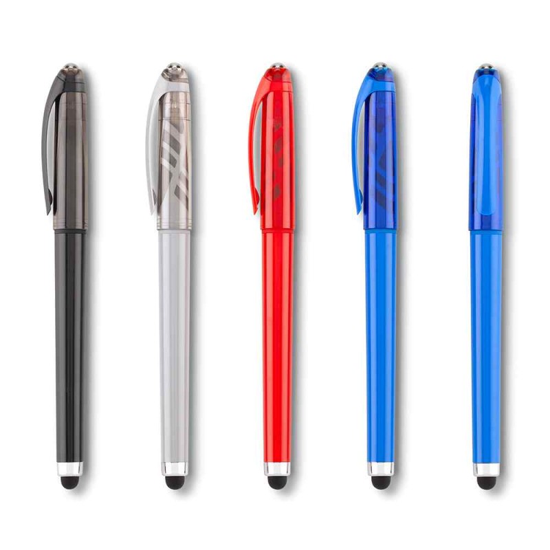 Bolígrafo plástico tipo roller con stylus. Medidas: 15.5 cm. Marca: 3 cm / Tampografía. Venta mínima y en múltiplos de caja de 50 unidades por color.