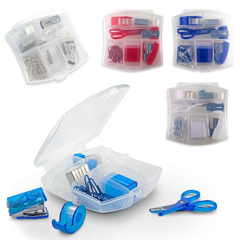Set de escritorio plástico con cinta, repuesto de cinta, ganchos, tijeras, quita ganchos, clips, tajalápiz y cosedora. Medidas: 10 cm x 11.5 cm x 3 cm Marca: 4.5 cm / Tampografía Ficha Técnica