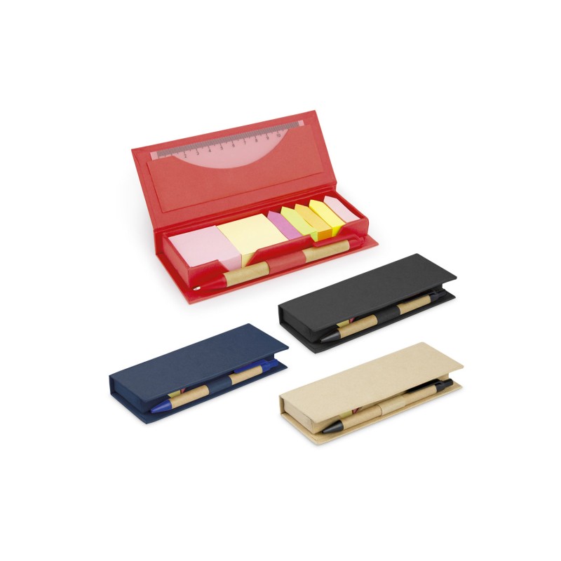 Estuche de cartón con bolsillo para regla de 12 cm, 2 memos de color con 110 hojas c/u y 5 banderas adhesivas en papel de diferentes colores. Incluye bolígrafo ecológico y porta bolígraf